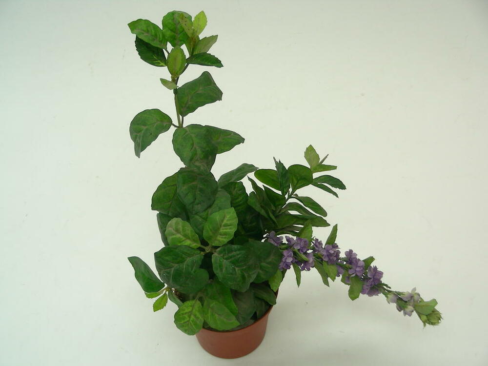 Pflanzenattrappe, Grünpflanze, lila Blüte, künstlich,Kunststofftopf