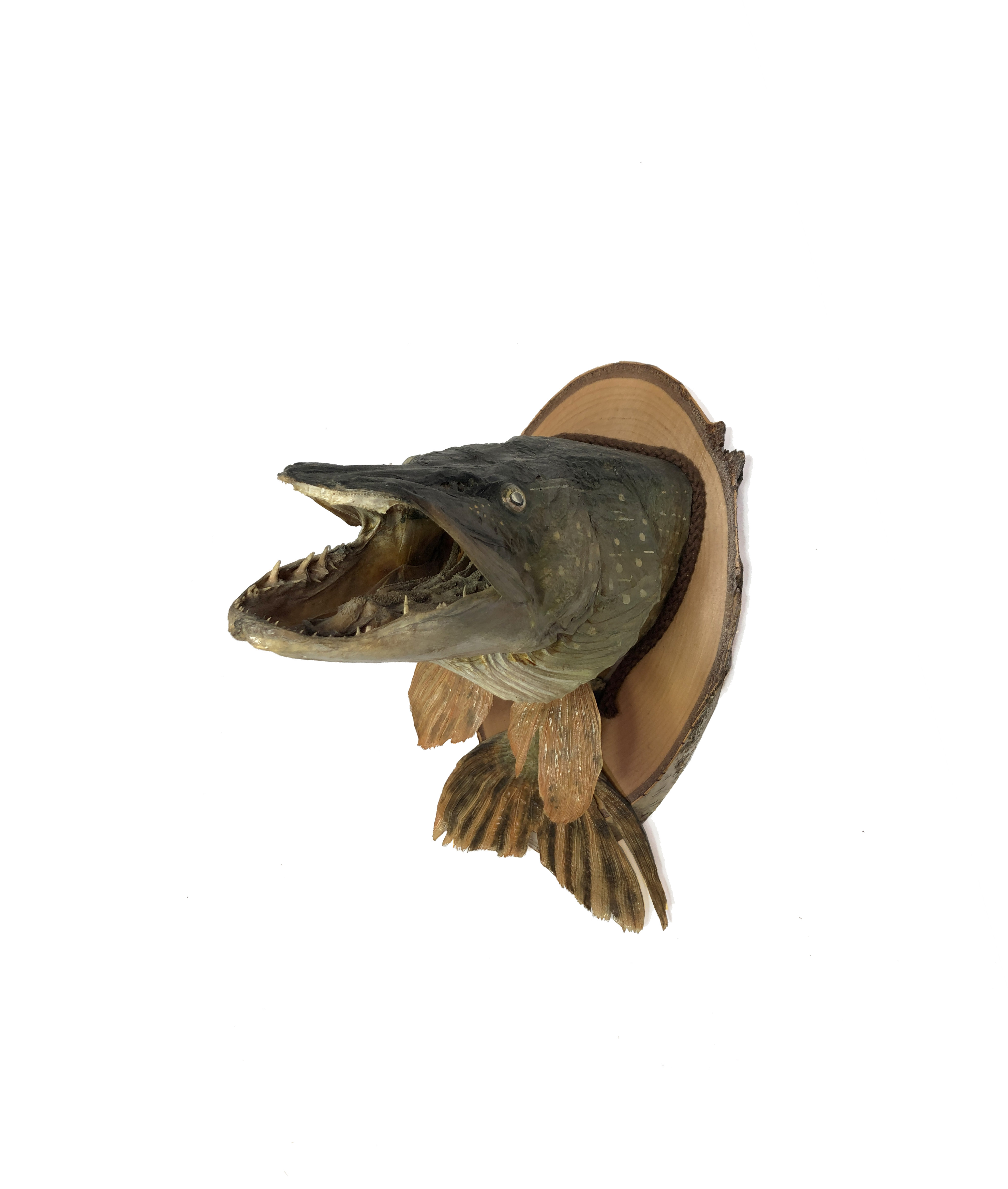 Fischattrappe, Hecht, mit Schwanzflosse, Präparat, auf Holzplatte, wandbefestigt