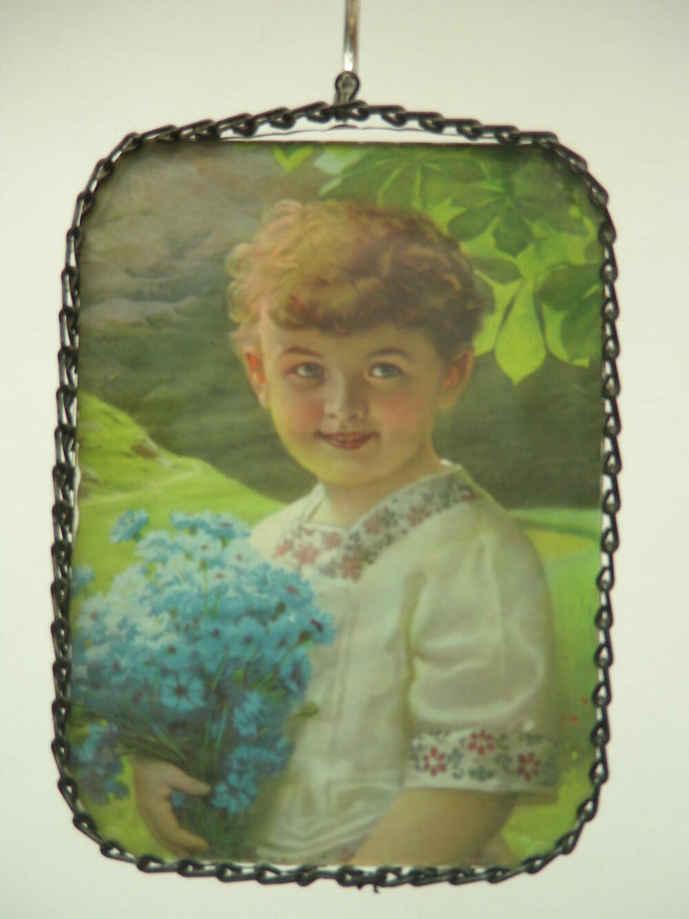 Bild, Kind mit Blumen, abgerundete Ecken, Kettenrahmen, Holz, Metall