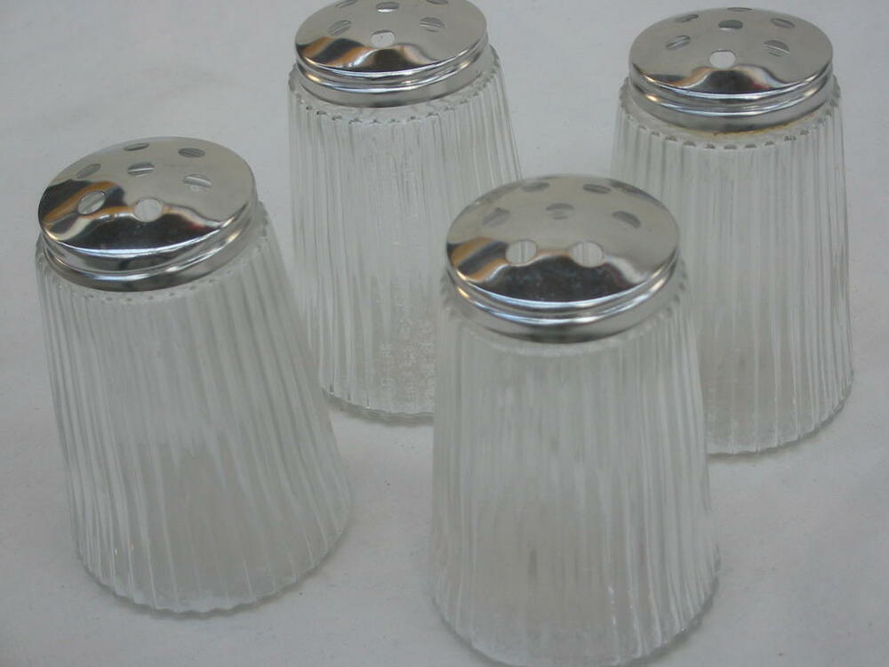 Zuckerstreuer, Kegel-Form, silberner Deckel mit großen Löchern, Schraubverschluß geriffeltes Glas