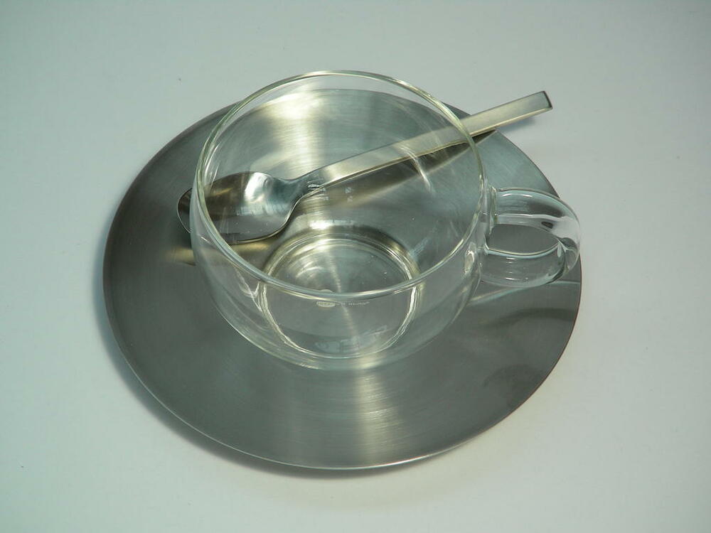 Beschreibung: Glas Teeglas, mit Henkel, Set mit Edelstahl - Untertasse und Löffel, "Jenaer Glas", passend zu Zuckerdose und Milchkäönnchen, K_kue_0400 und K_kue_0401