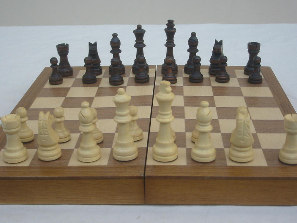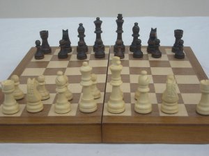 Spielzeug, Schach, Holzfiguren, 31-teilig (ein weißer Bauer fehlt), mit Spielfigurenkasten als Schachbrett