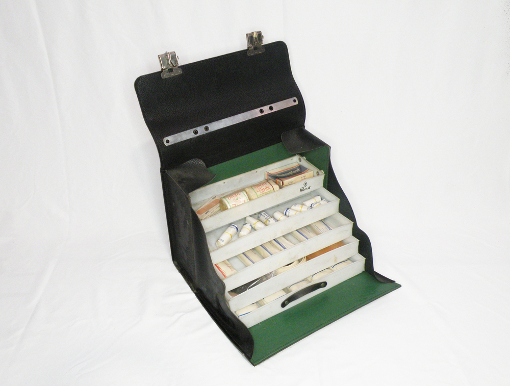 Koffer; Werkzeugkoffer, Arztkoffer, historisch, 70-er, mit 5 Schubladen, historisches Verbandsmaterial