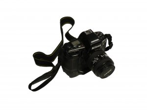 Kamera, "Nikon MB10", mit Transportmotor und Objektiv, ohne Funktion