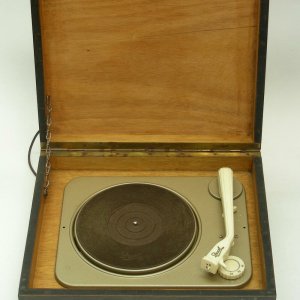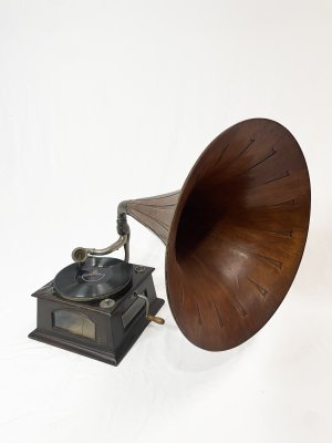 Beschreibung: Grammophon, Schallplattenspieler, Plattenspieler,mit ausladendem Holztrichter, D= ca. 60cm,Kurbel für Aufzugsmechanismus, Corpus mit Scheiben, seltenes Fundstück