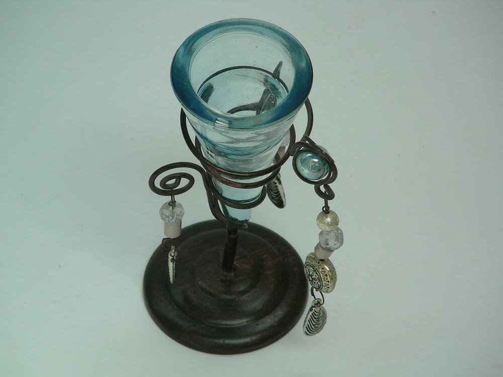 Windlicht, Teelichthalter, Metallfuß, perlenverziert, Glaskegel