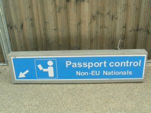 Schild wechselbar: "Brisbane airport" oder "Passport control", Standesamt, Holz, Plexi, mit Füßen