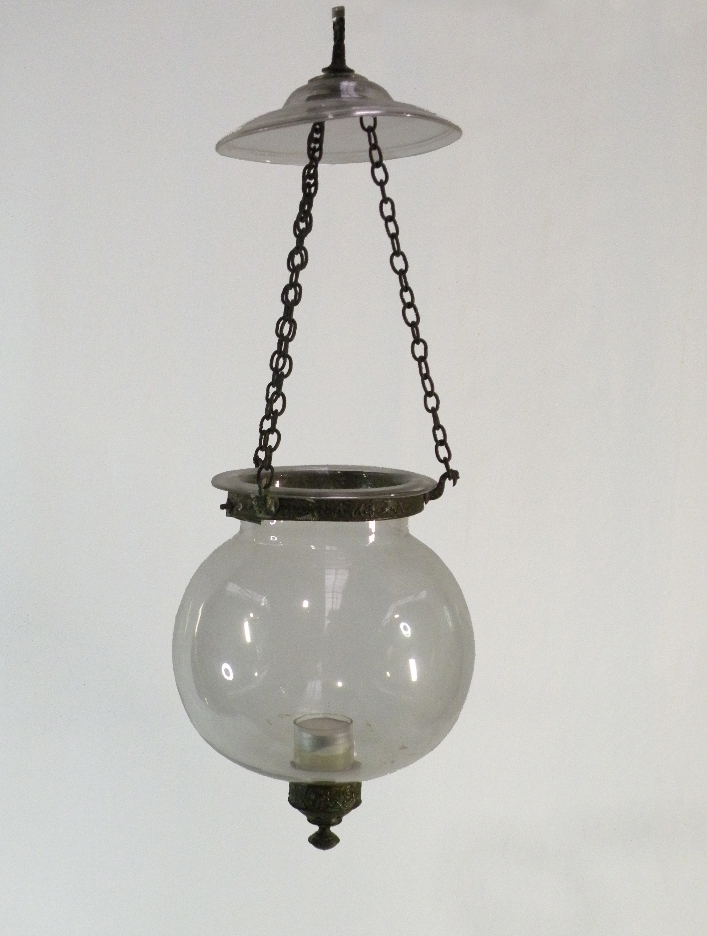 Windlicht, Stahl mit Verzierungen, Glaskolben mit Teelichteinsatz, historisch