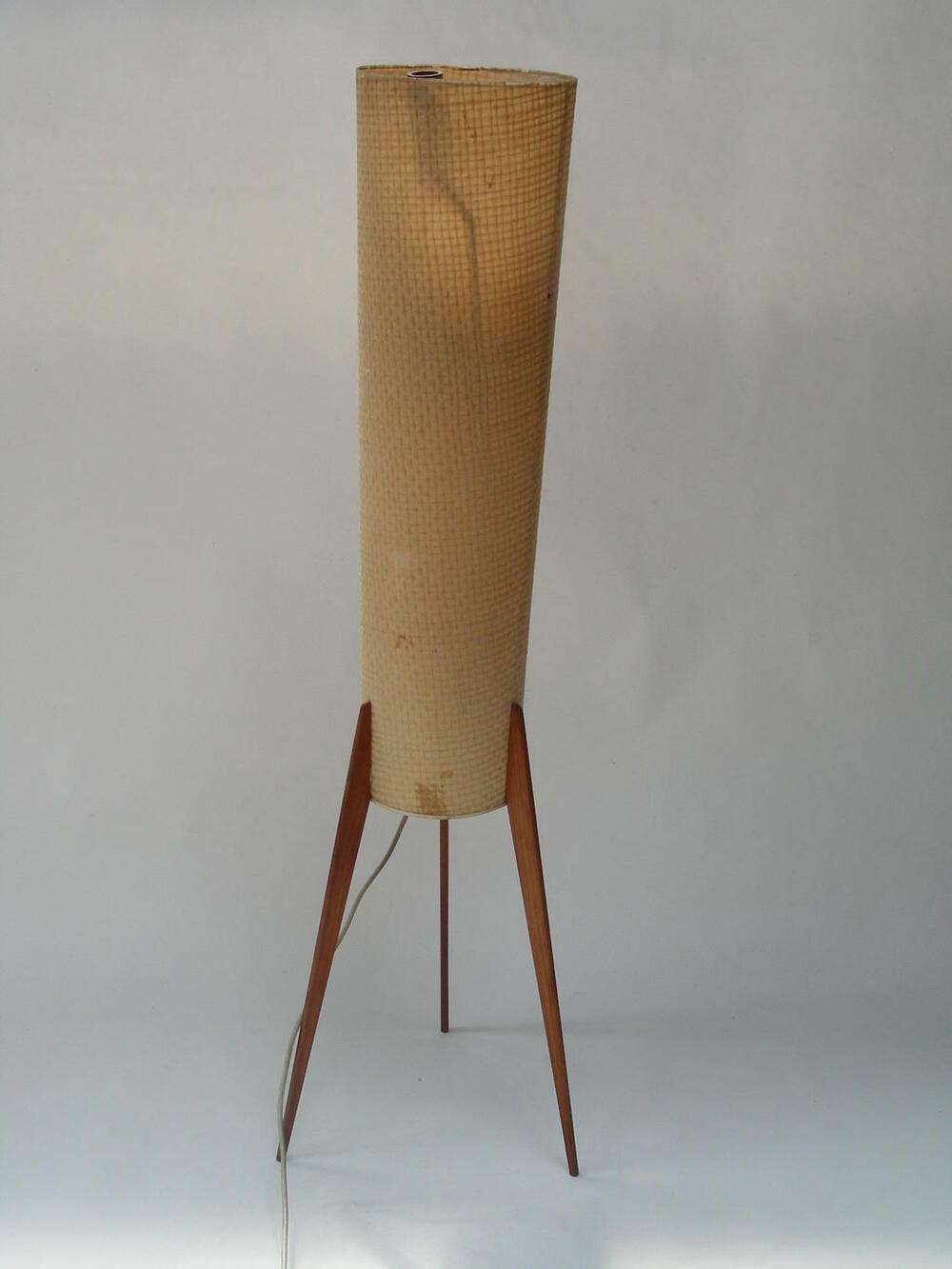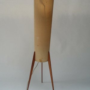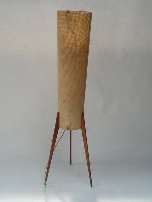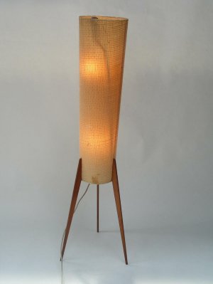 Bodenleuchte, Stehleuchte, 2 Fassungen, 3-Bein, Holzfüße, Gewebeschirm, dänischer Stil
