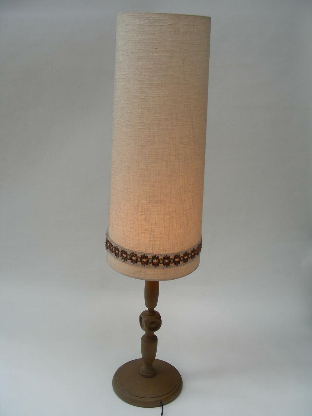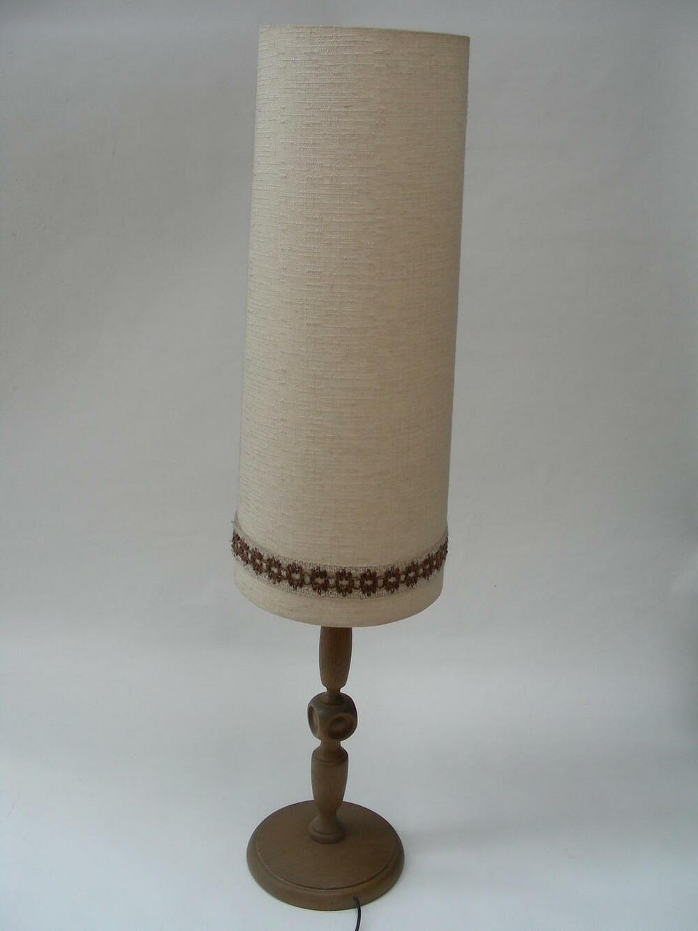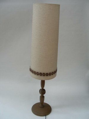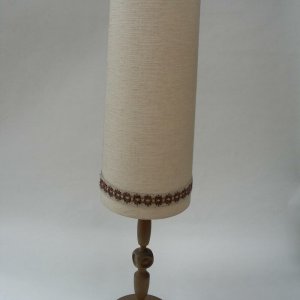 Bodenleuchte, Stehleuchte, Holzfuß, Stoffschirm, Borte