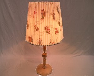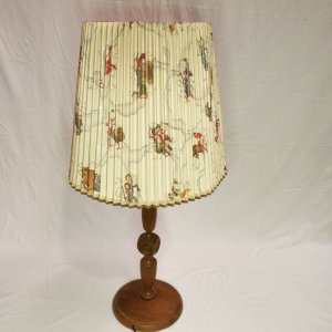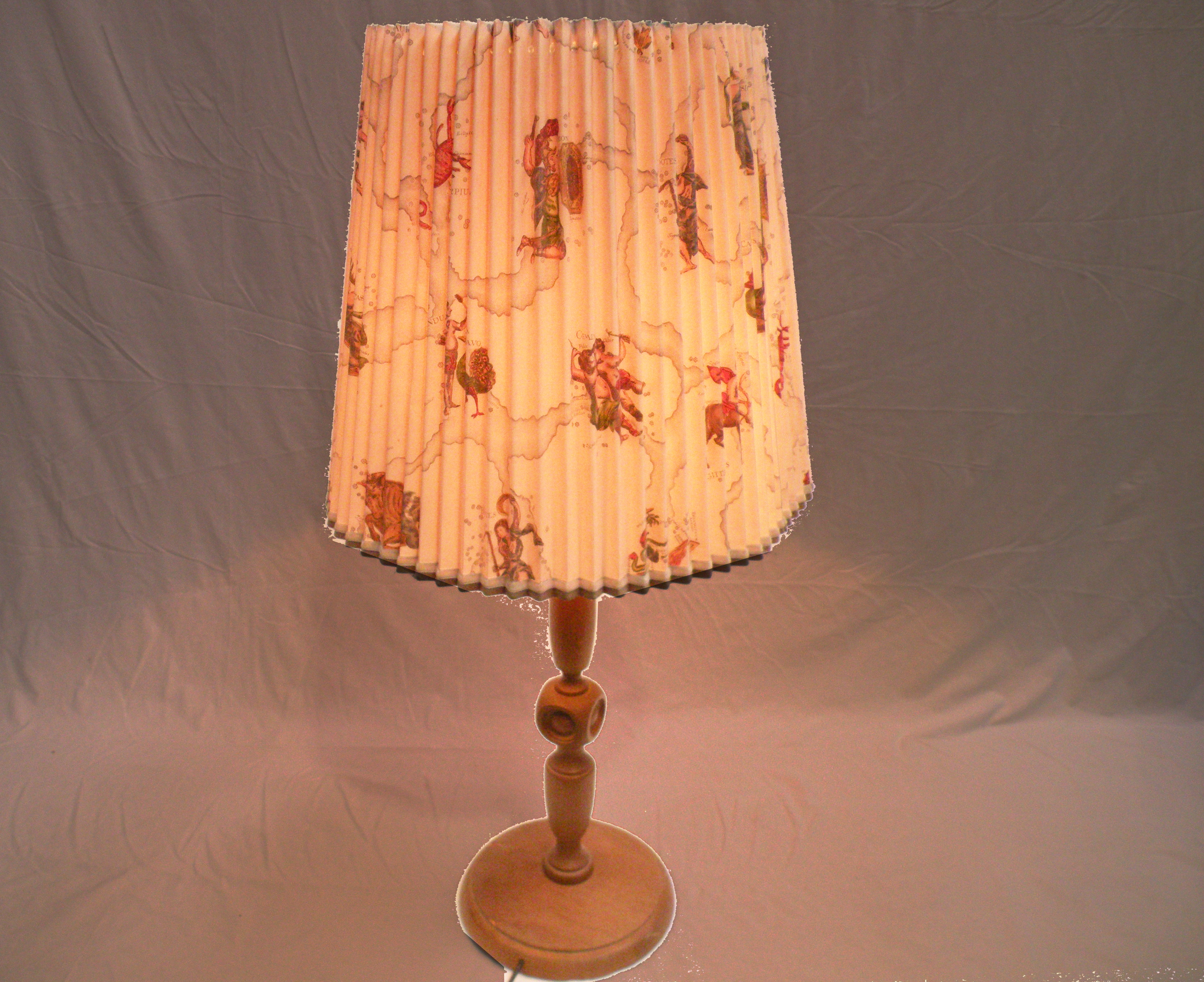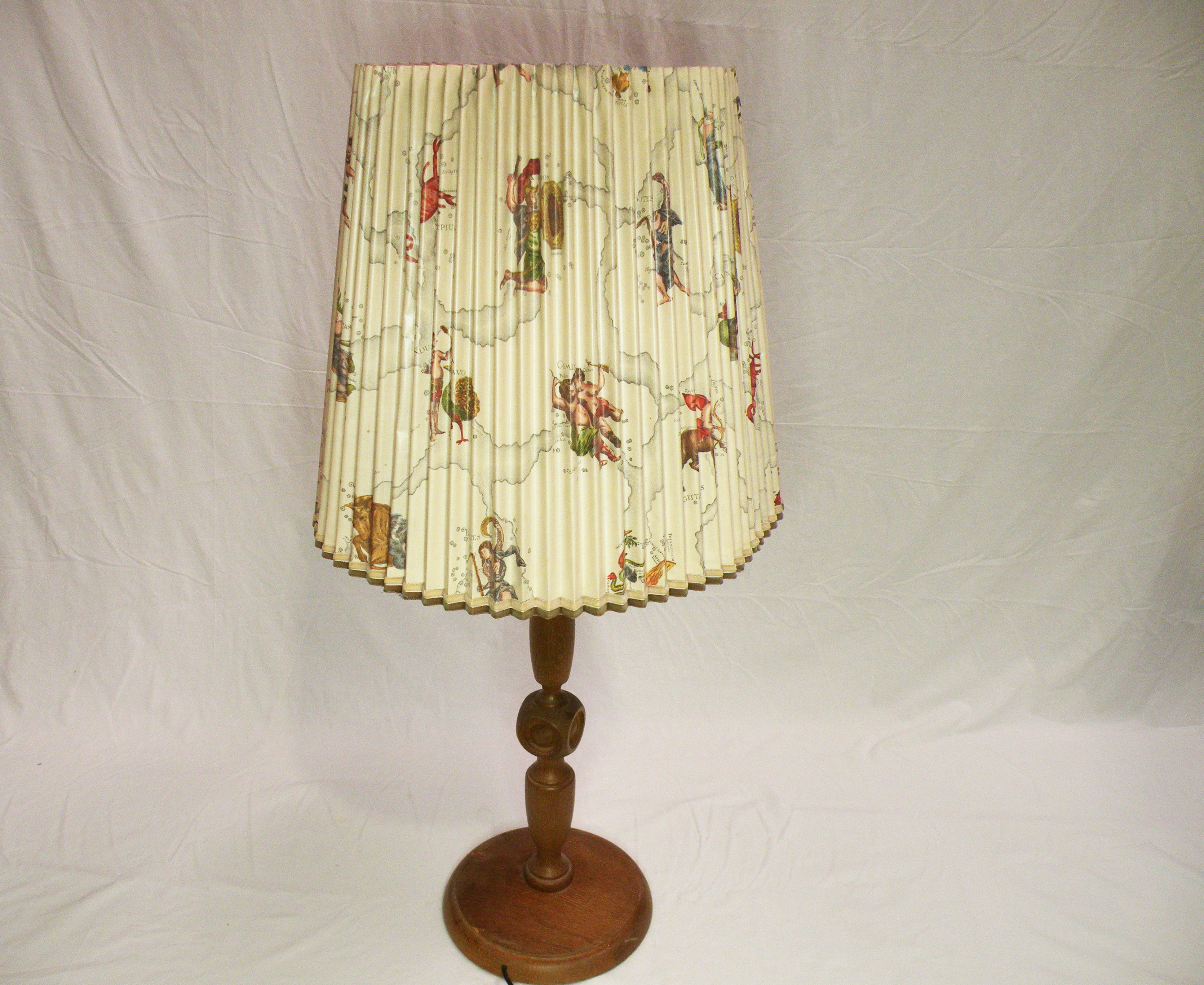 Stehleuchte, 70-er, Holzfuß, Schirm gefächert, bedruckt mit Motiv "Sternzeichen"