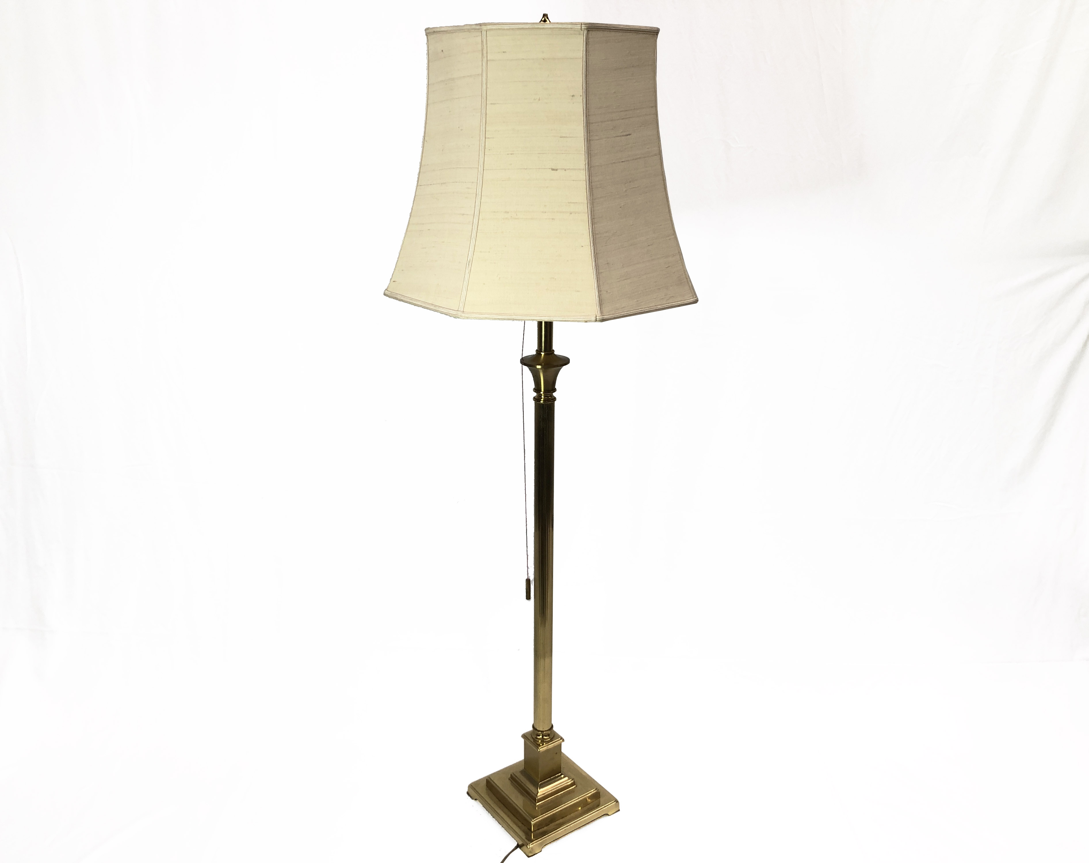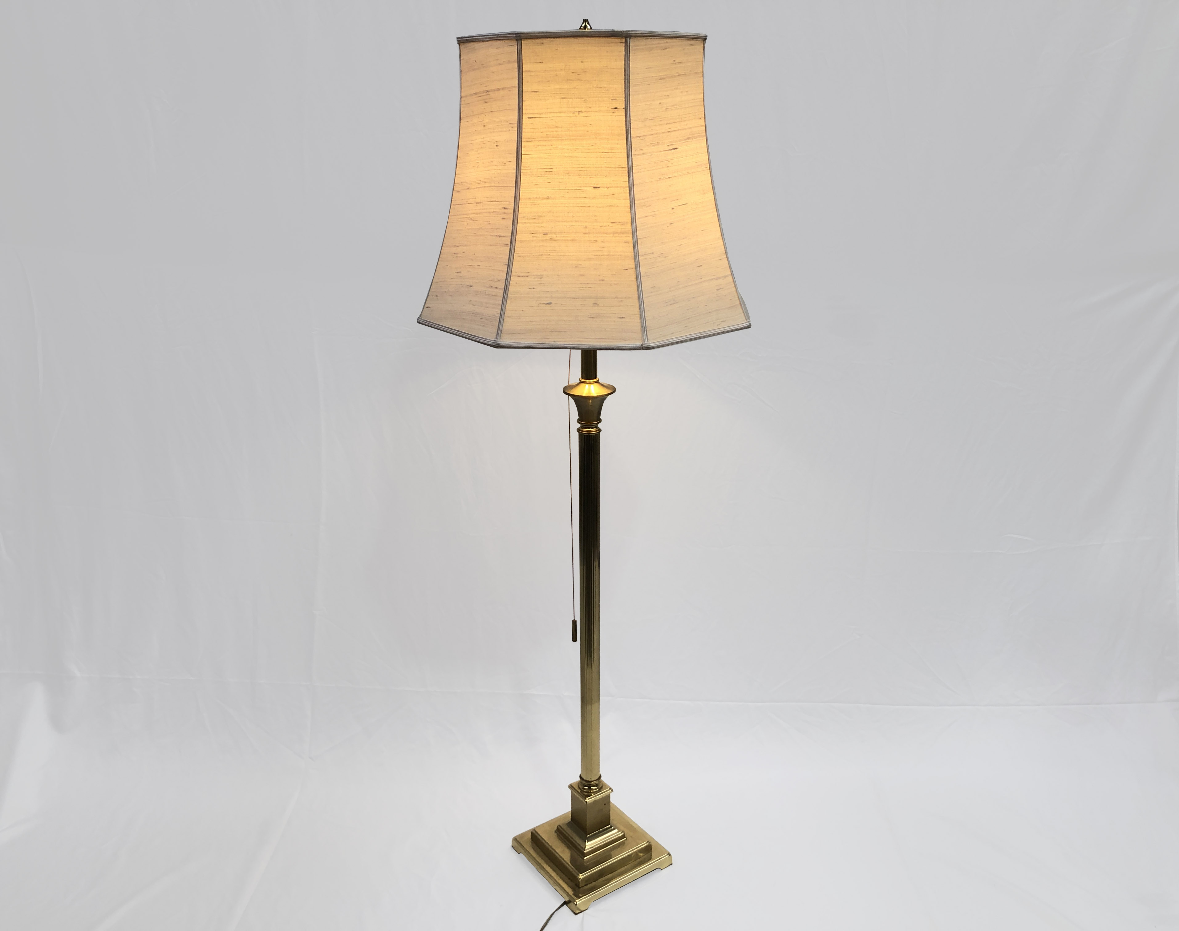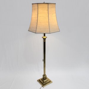 Bodenleuchte, Stehleuchte, Metallfuß, Stoffschirm achteckig, Stoff grobe Struktur, 2-flammig, Zugschalter