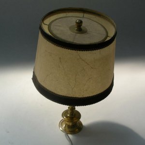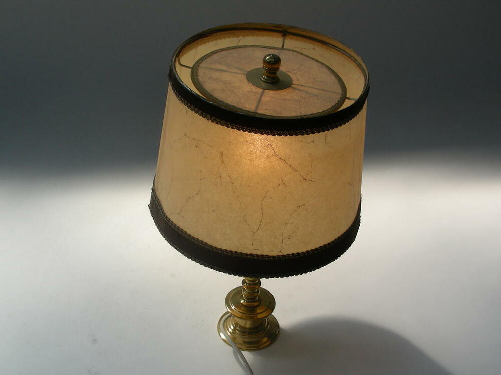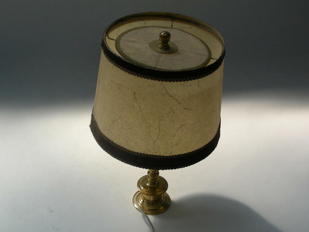 Tischleuchte, Messingfuß, Stoffschirm, Borte