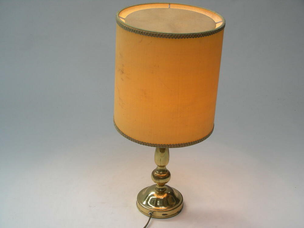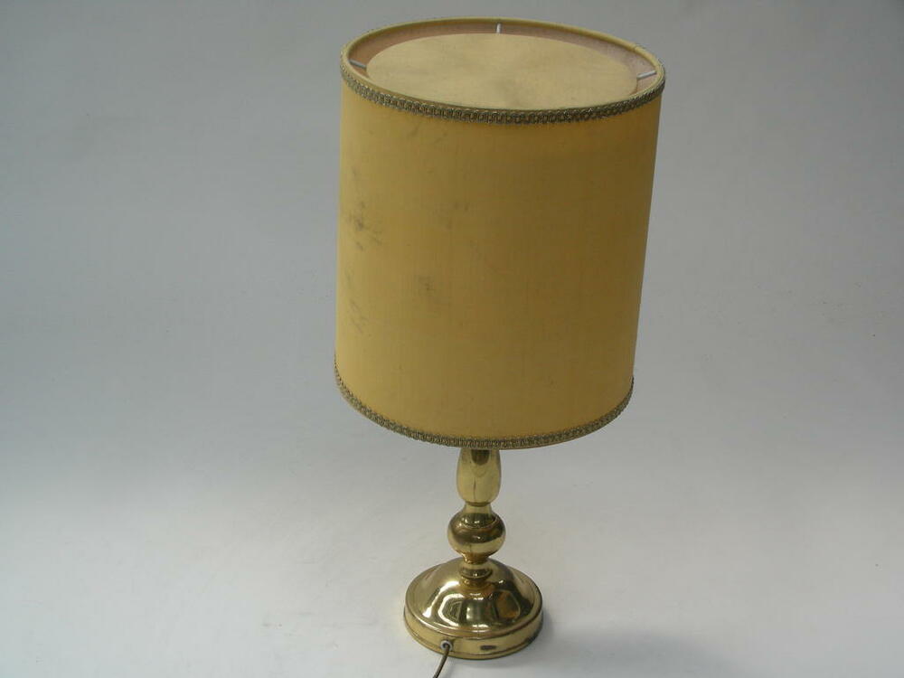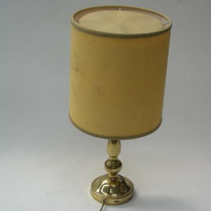 Tischleuchte, Messingfuß, Stoffschirm, Borte