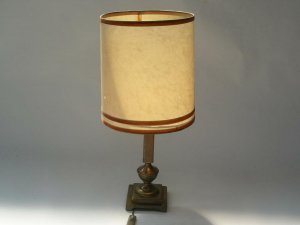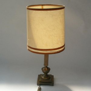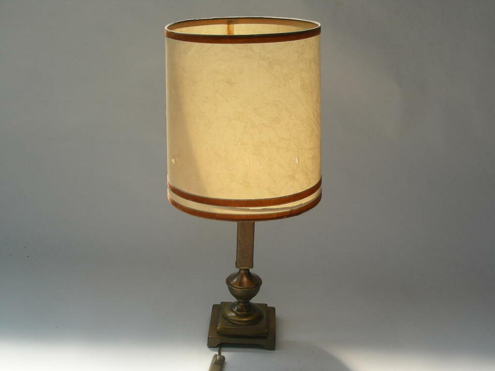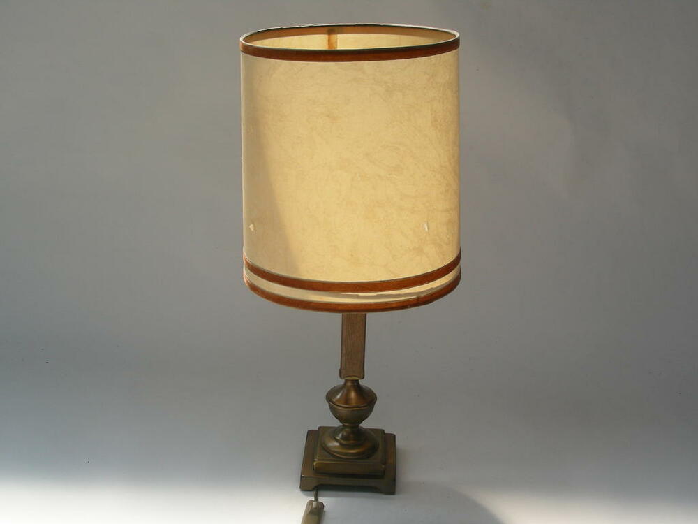 Tischleuchte, Messingfuß, Holzimitat - Bein, Kunsstoffschirm, Borte