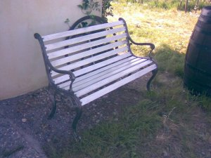 Bank, Gartenbank, Guß-Armlehne, Holzbeplankung, weiß lackiert, patiniert, retro 1990