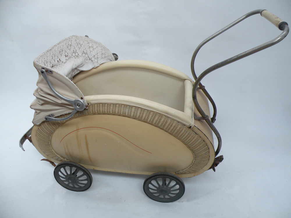 Kinderwagen, antik, klappbarer Himmel, Korbgeflecht-Dekor