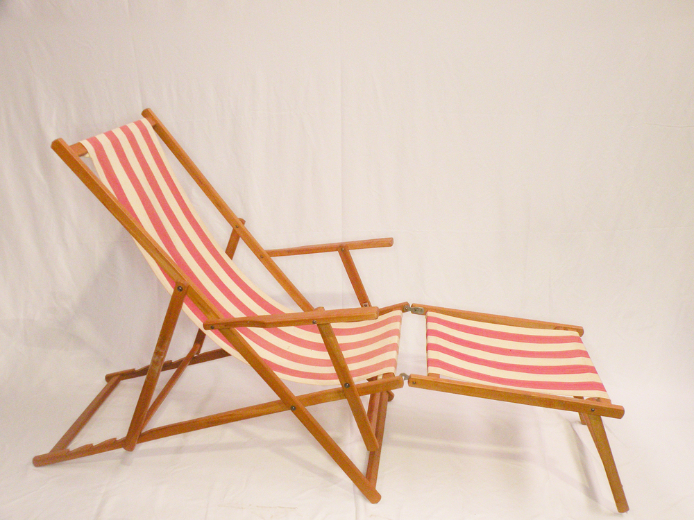Sonnenliege, 70-er, Holz / Stoff, gestreift, 2-teilig mit separater Fußablage zum Einhängen, höhenverstellbar