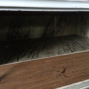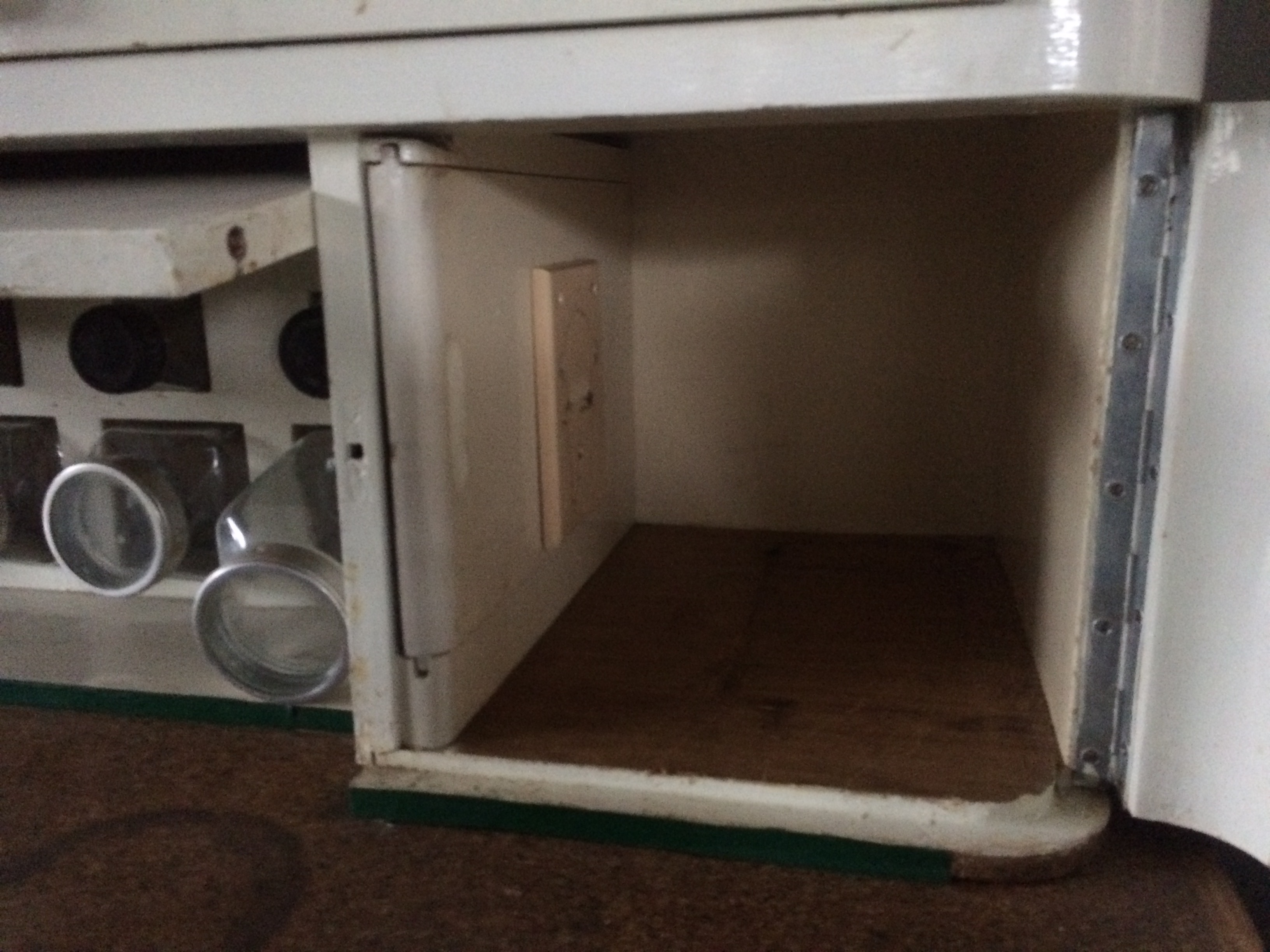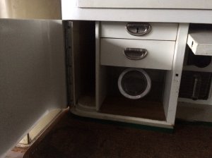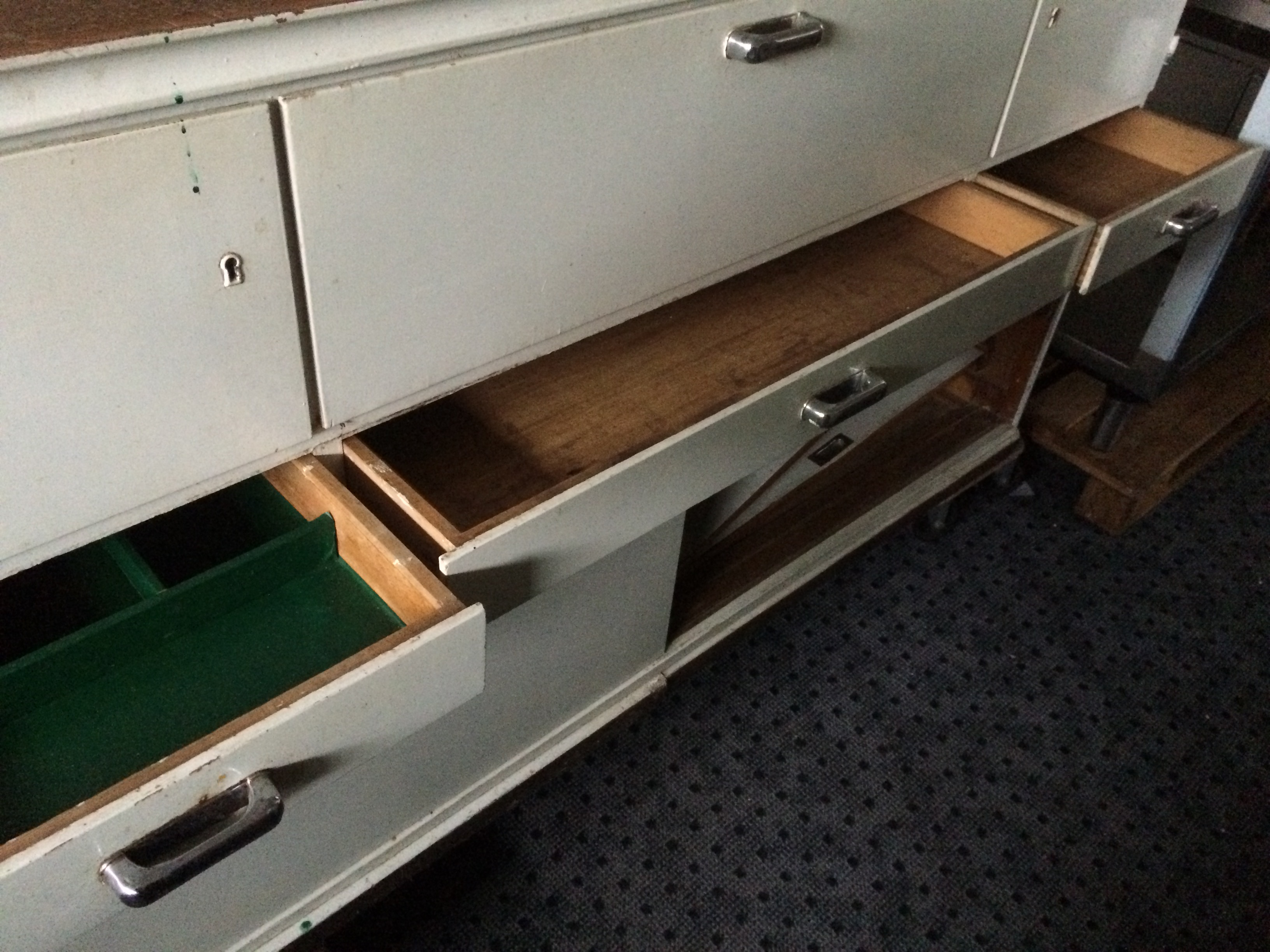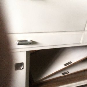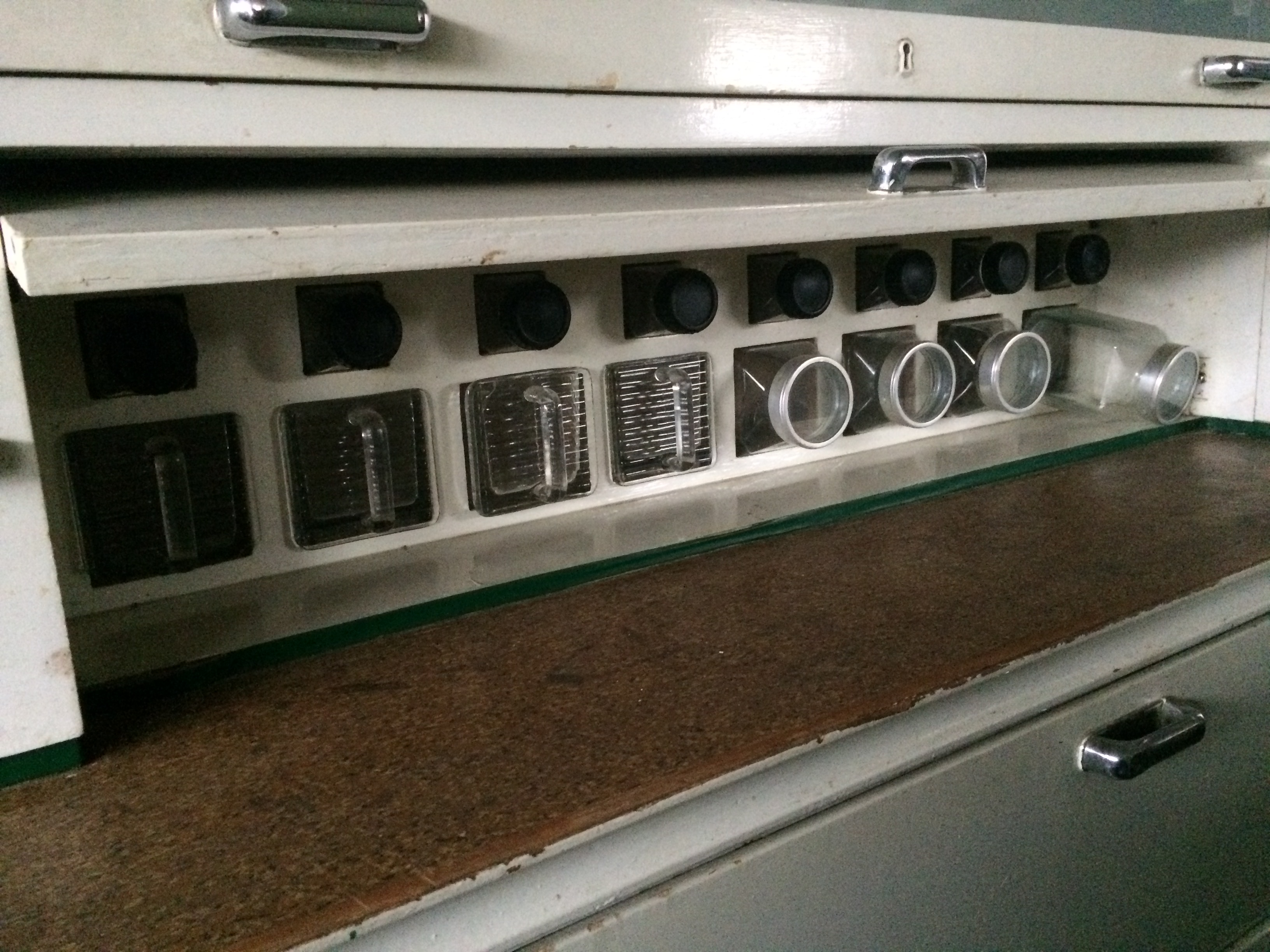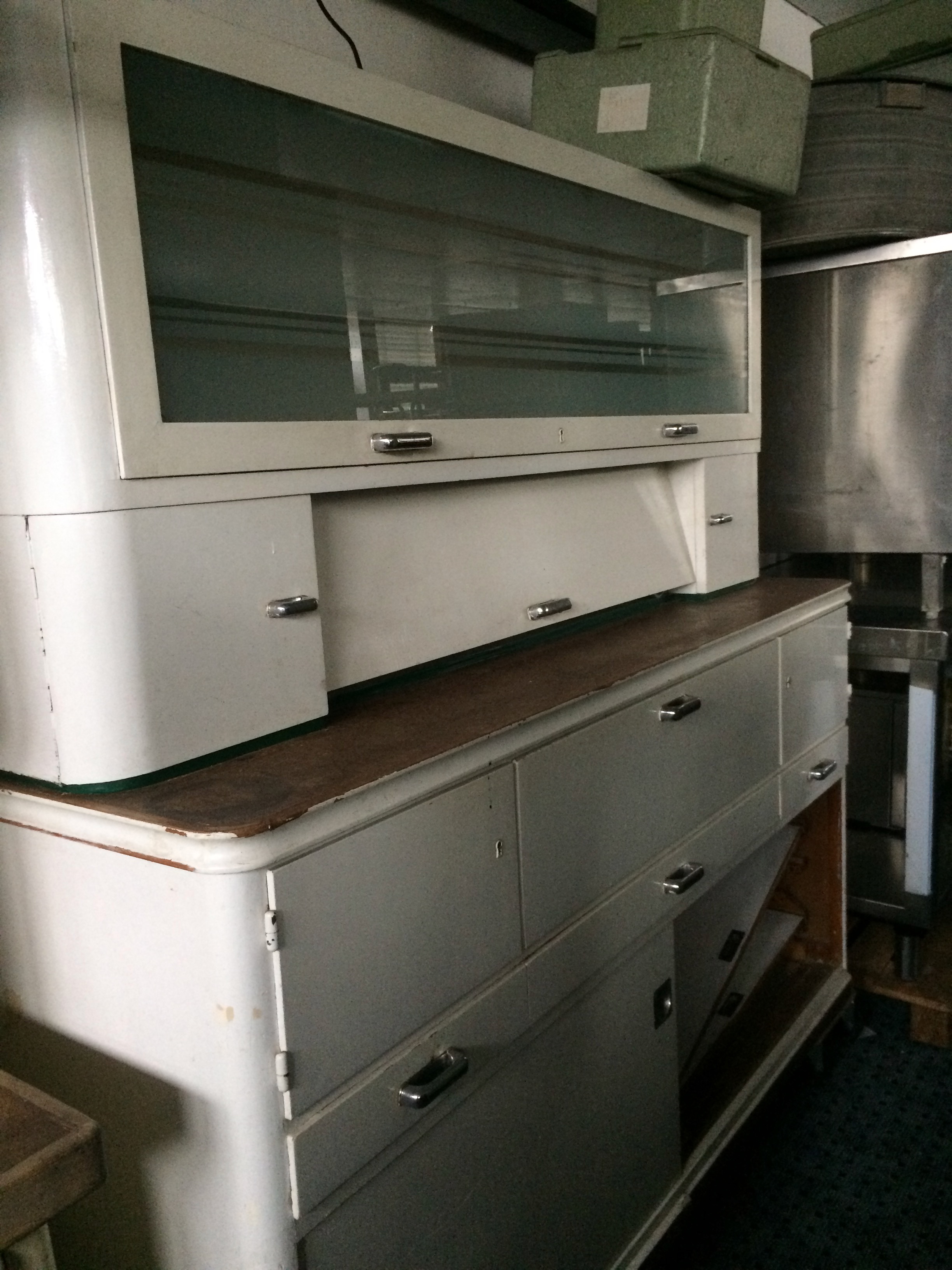 Küchenschrank, Melberger, 1950/60, weiß lackiert, Glas-Klappelement nach oben aufgehend, Arbeitsfläche Linoleum, altertypischen Gebrauchsspuren, Klappe mit dahinterliegenden Vorratsgläsern, Gläser größtenteils erhalten, Brotfach, 3 Schubladen, Schiebetürelemente, Gebrauchsspuren original, kein Schlüssel vorhanden