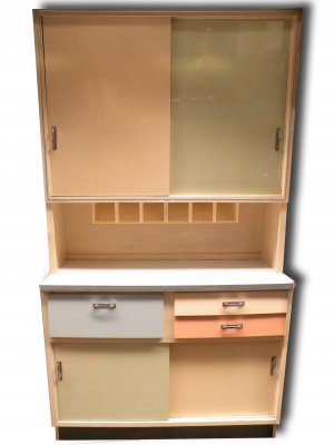 Küchenschrank, 60-er, 2-er-Teilung, Schiebetüren, Brotfach, mit Glaseinschüben, Schubladen, 2teilig, Chromgriffe