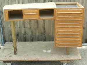 Tisch, Schreibtisch, Optiker - Verkaufstisch, Schubladen mit Brillenfächern, Holzfurnier, Metallfüße