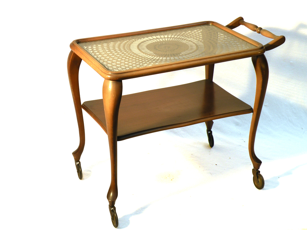 Teewagen, rollbar, Chippendale, Glasscheibe auf Strohgeflecht, zwei Ebenen
