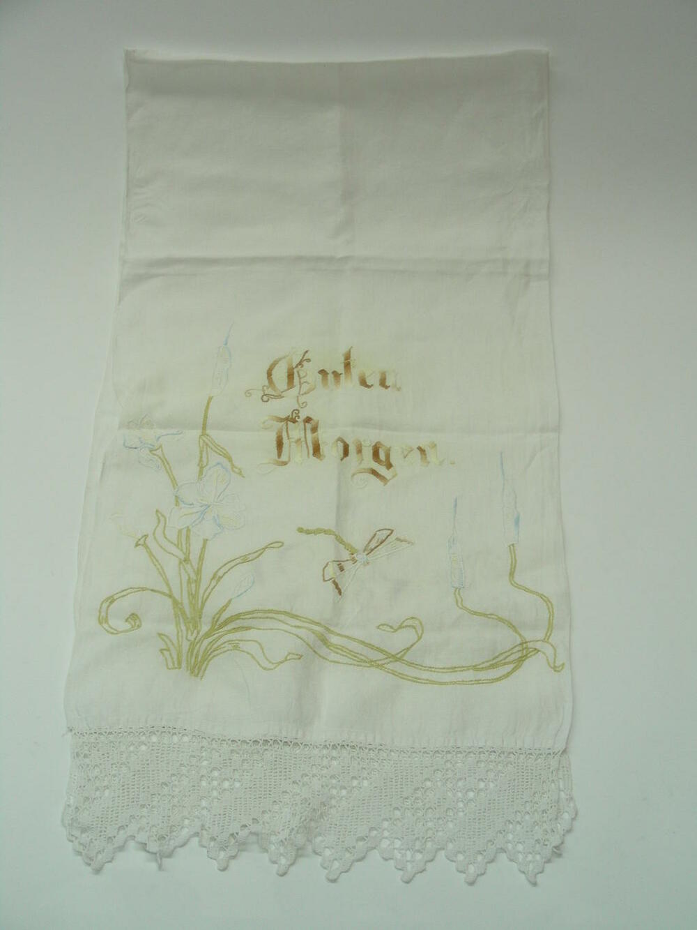 Tischläufer, bestickt mit Blumen und Schriftzug "Guten Morgen" und Monogramm, Häkelspitze am Abschluss, auch als Wandbehang verwendbar