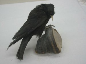 Vogel, Krähe, präpariert, auf Baumpilzsockel, selbststehend