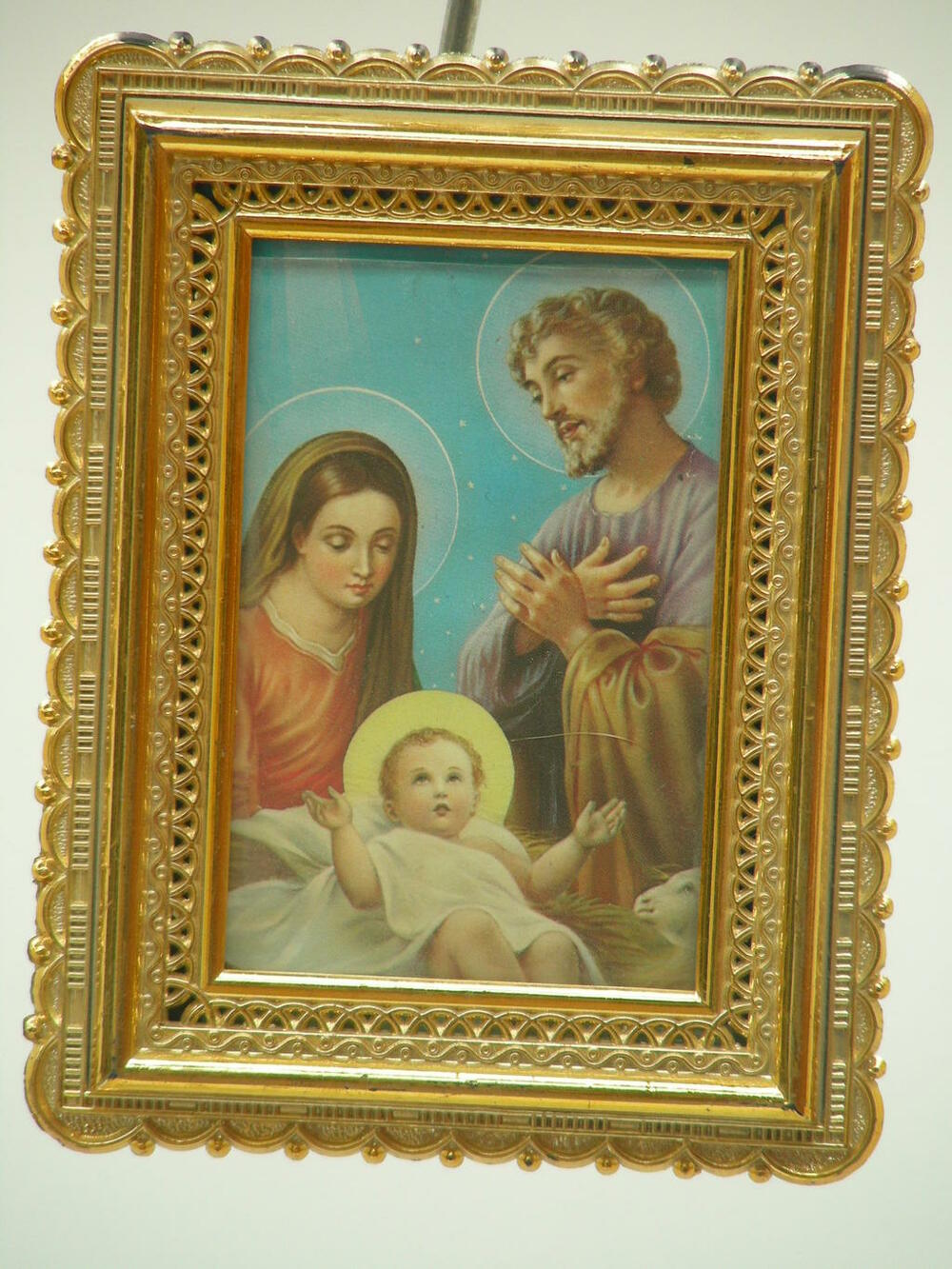 Bild, religiös, Maria und Joseph mit Kind, Kunststoffrahmen, verziert,