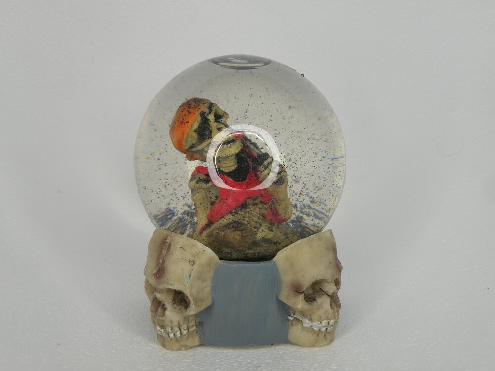 Schneekugel, Motiv "Tod", schwarzer Schnee, Totenschädel als Sockel, d= 0,08