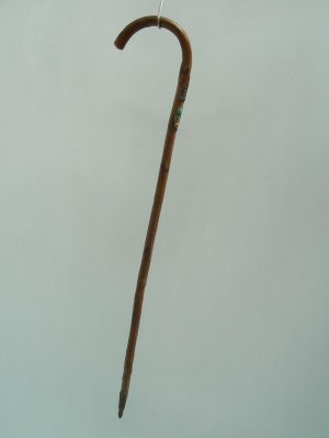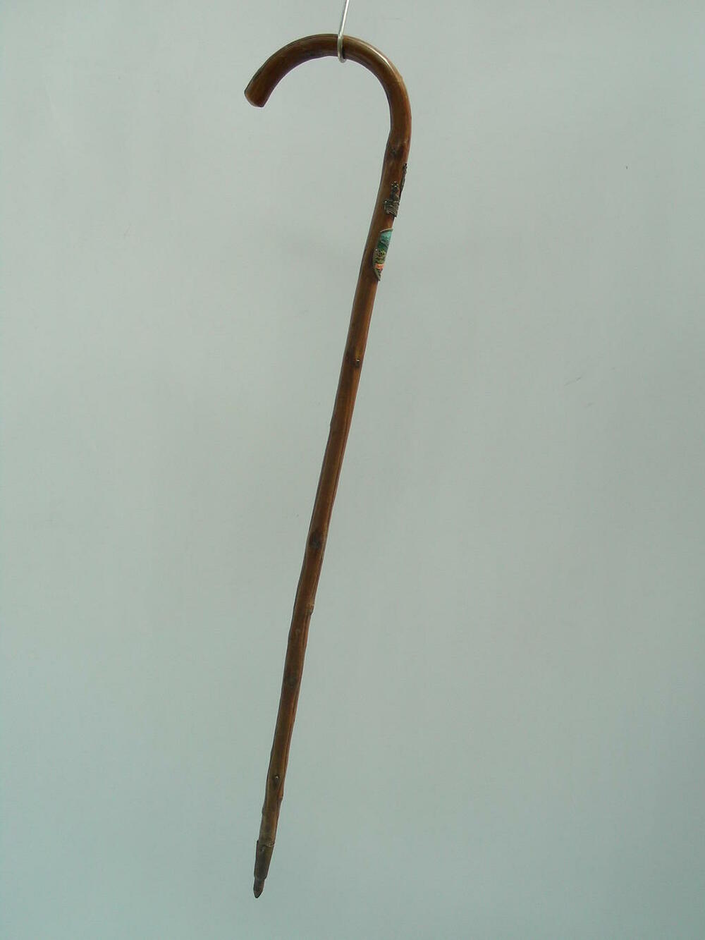Spazierstock, Wanderstock, gebogener Griff, Stahspitze, Astholz, Metallplakette "Gams" und "Unterjoch/Allgäu"