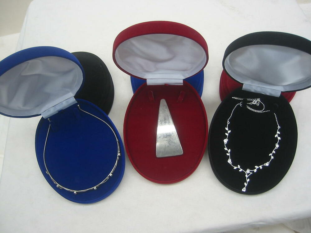 Schmuckschatulle, Collier-Box, oval, Samt, Deckel öffenbar und innen mit weißem Satin ausgeschlagen, ohne Inhalt