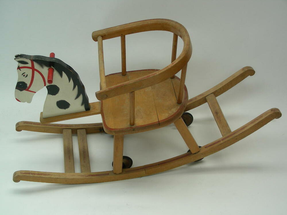 Schaukelpferd, mit Kindersitz und Rädern, bemalt, Holz