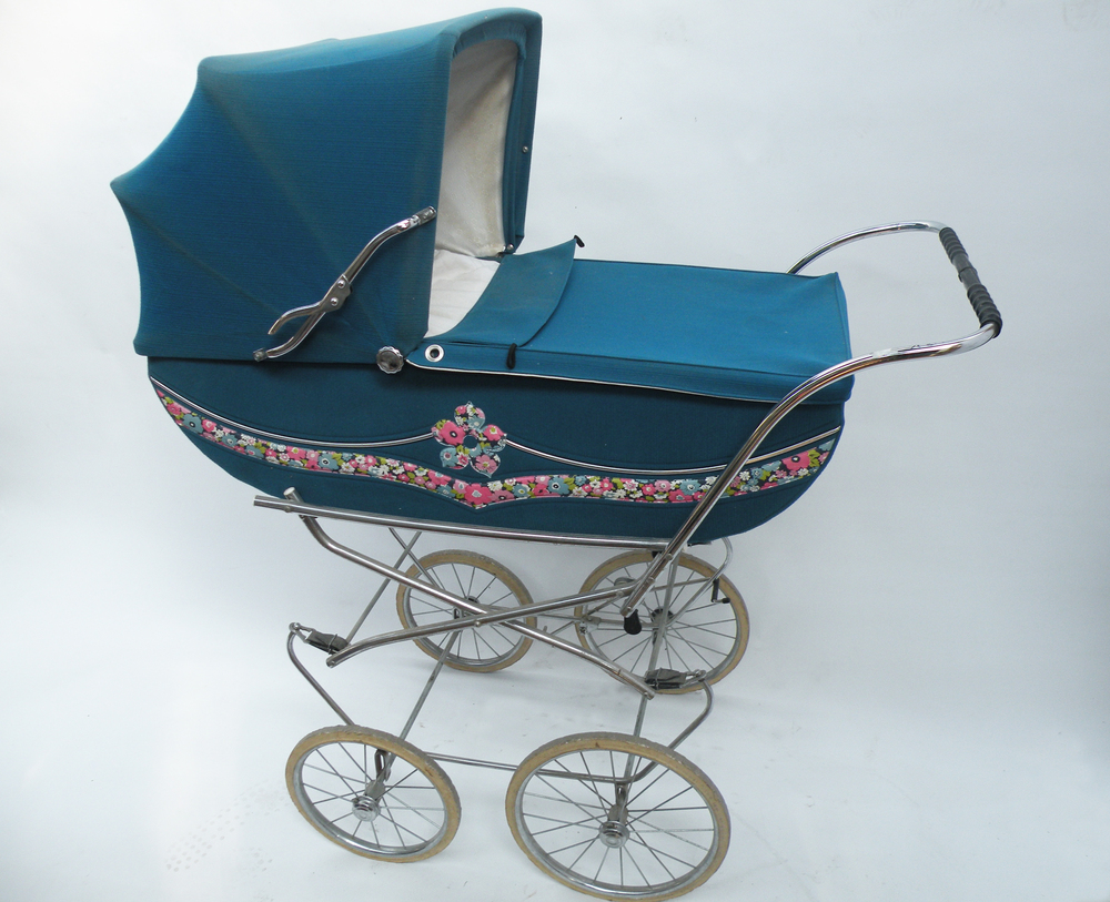 Kinderwagen, 70-er, klappbarer Himmel, Blumendekor, Chromräder