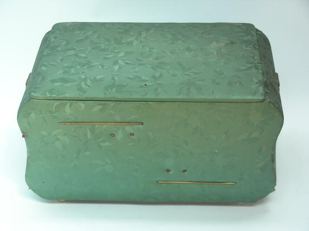 Kunststoffbezug, florales Muster, Messinggriffe, Holzfüße