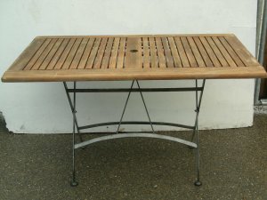 Tisch, Gartentisch, klappbar, Loch mittig für Sonnenschirm, Metall, Teak