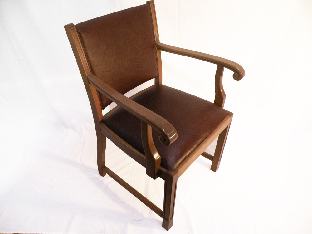 Stuhl, Armlehnstuhl, Art-Decó-StilHolzrahmen, Rückenlehne Leder genietet, Ledersitzfläche, ehemalige Gerichtsstühle